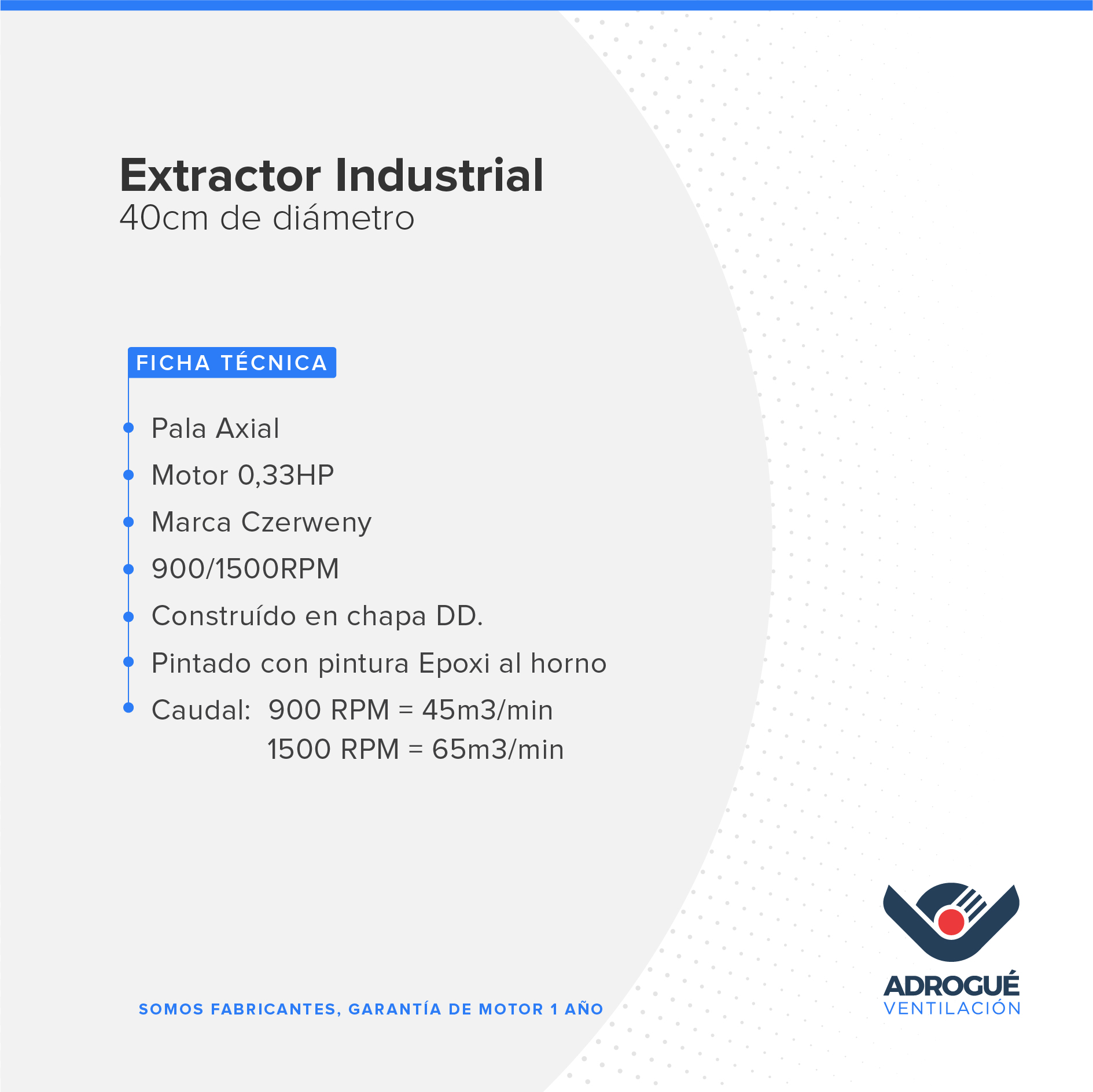 Extractor industrial axial de 400 mm de diametro. Helice de 6 hojas de metal remachadas sobre porta pala de hierro y soporte aboquillado para una mejor toma de aire. Recubiertos con pintura epoxi. Caudal de 65 m3/m. Motor de 0,33 x 1500 rpm 220v